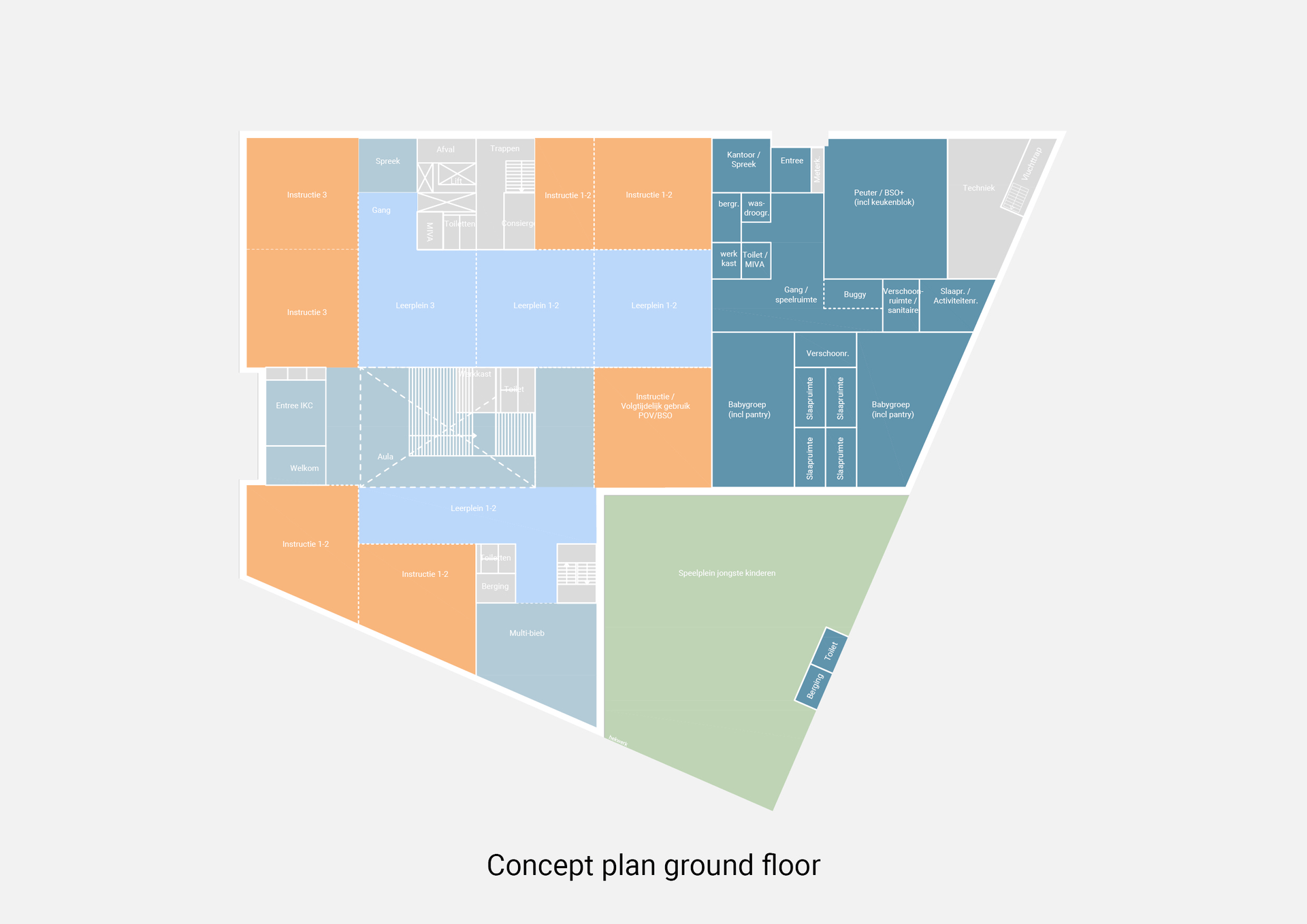 Weespertrekvaart in Amsterdam is a major urban transformation area. On Plot 1 a multifunctional development anchors the new neighbourhood: Plot 1A hosts IKC Weespertrekvaart as an “all-in-one school”, while Plot 1B combines social and commercial functions with two residential blocks above. An Integrated Child Center (IKC) brings together a primary school, daycare, after-school care, playgroup and a public sports hall under one roof, enabling shared facilities and a strong community identity. Because the outdoor space directly next to the school is limited, the public square at the front and the roofscape become essential extensions of daily learning—green, playable places that support safe arrival, informal meeting and outdoor education. In this compact setting, the building must work as city piece and campus at once, every day.