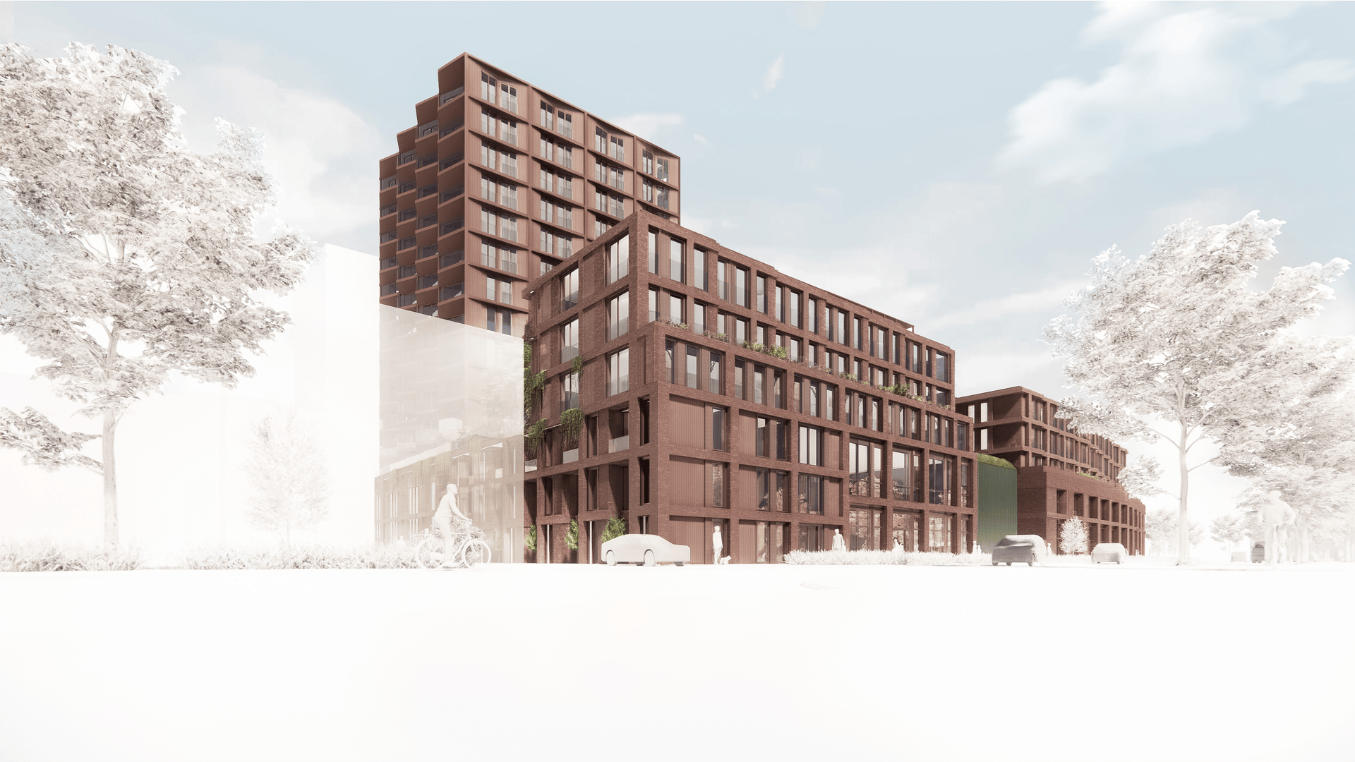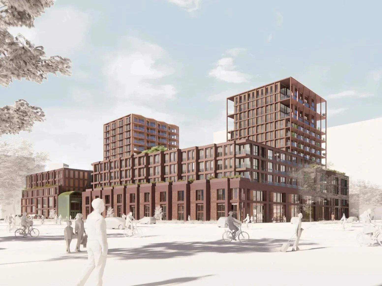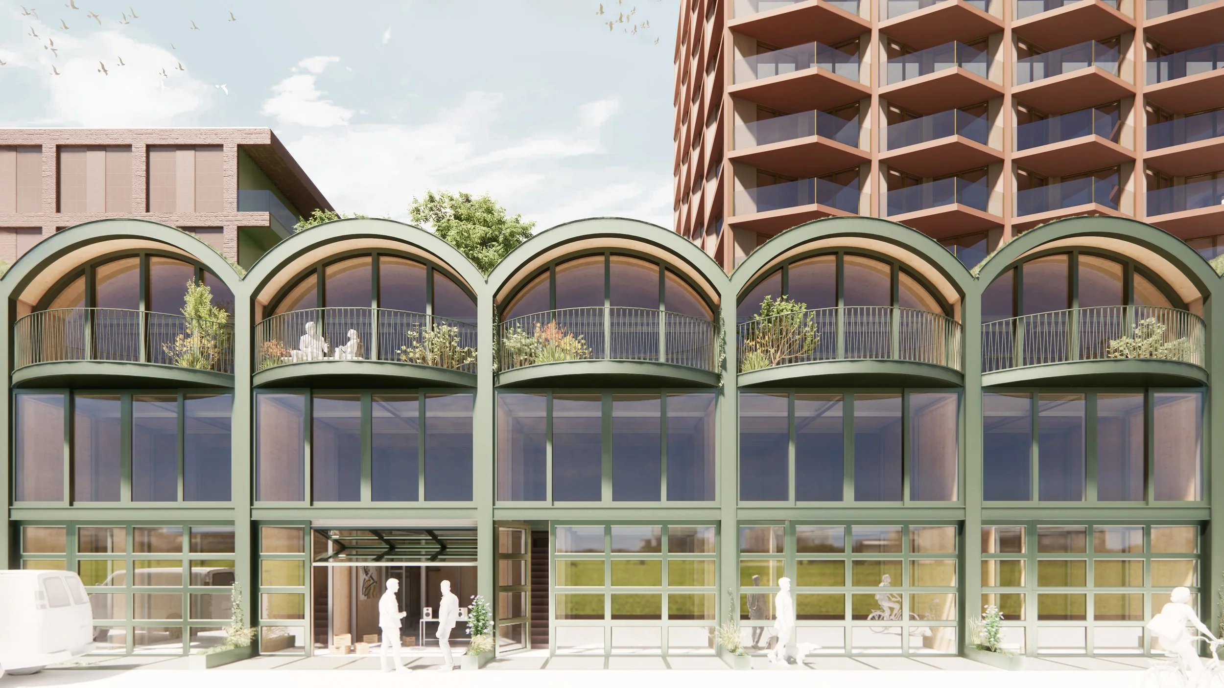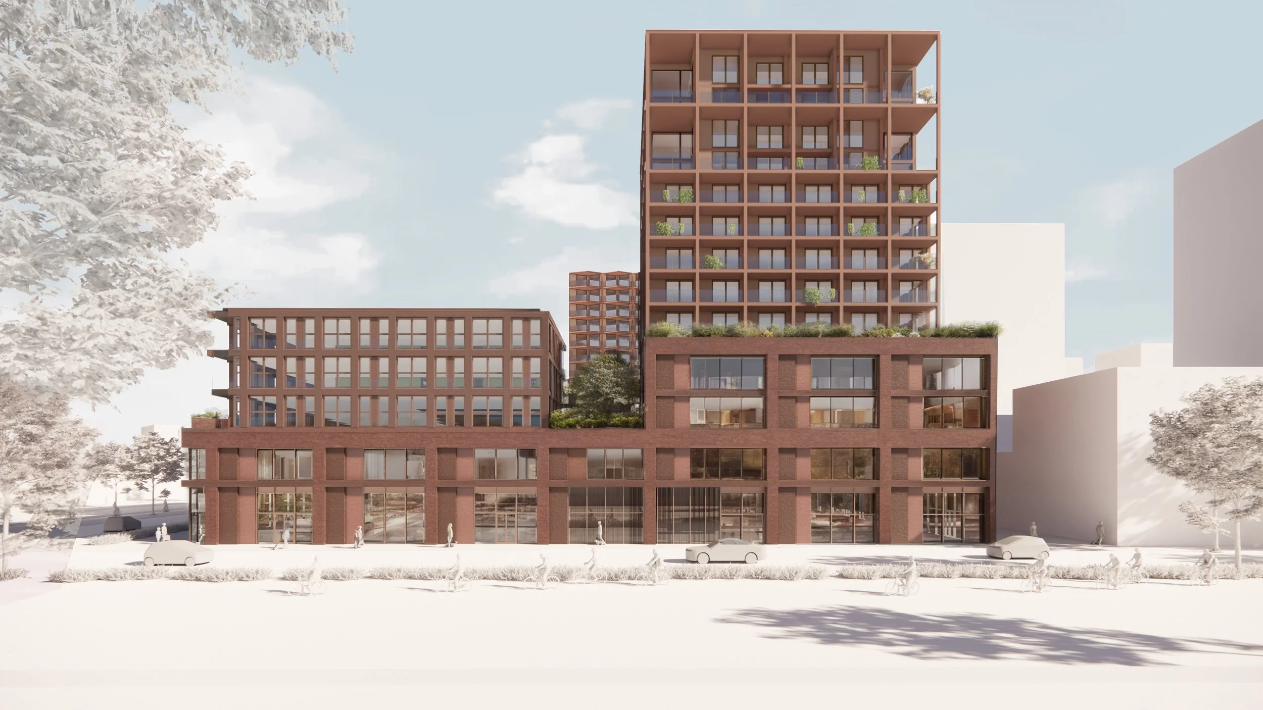 Architecturally, the design expresses identity and vitality through active, human-scaled orientated street facades. Double-height transparent plinths along Motorkade integrate retail, workspaces, cafés, maisonettes and care facilities, ensuring continuous interaction between building and city. The street frontage avoids uniform glazing, offering contrast and variety. A carefully composed massing maintains clear relationships between towers and surrounding streets. The ensemble is unified by a striking façade grid reminiscent of a Scottish tartan: deep red ceramic and stone articulate the lower volumes, while metallic finishes define the towers. Between the blocks, studio apartments reference the historic curved roofs and workshops of the Hamerkwartier, reinterpreted in green brick and textured cladding. Nature-inclusive rooftop gardens extend this identity, providing shared outdoor spaces that promote biodiversity, comfort and community life. High-density urban development requires innovative solutions for high-quality, accessible green space.