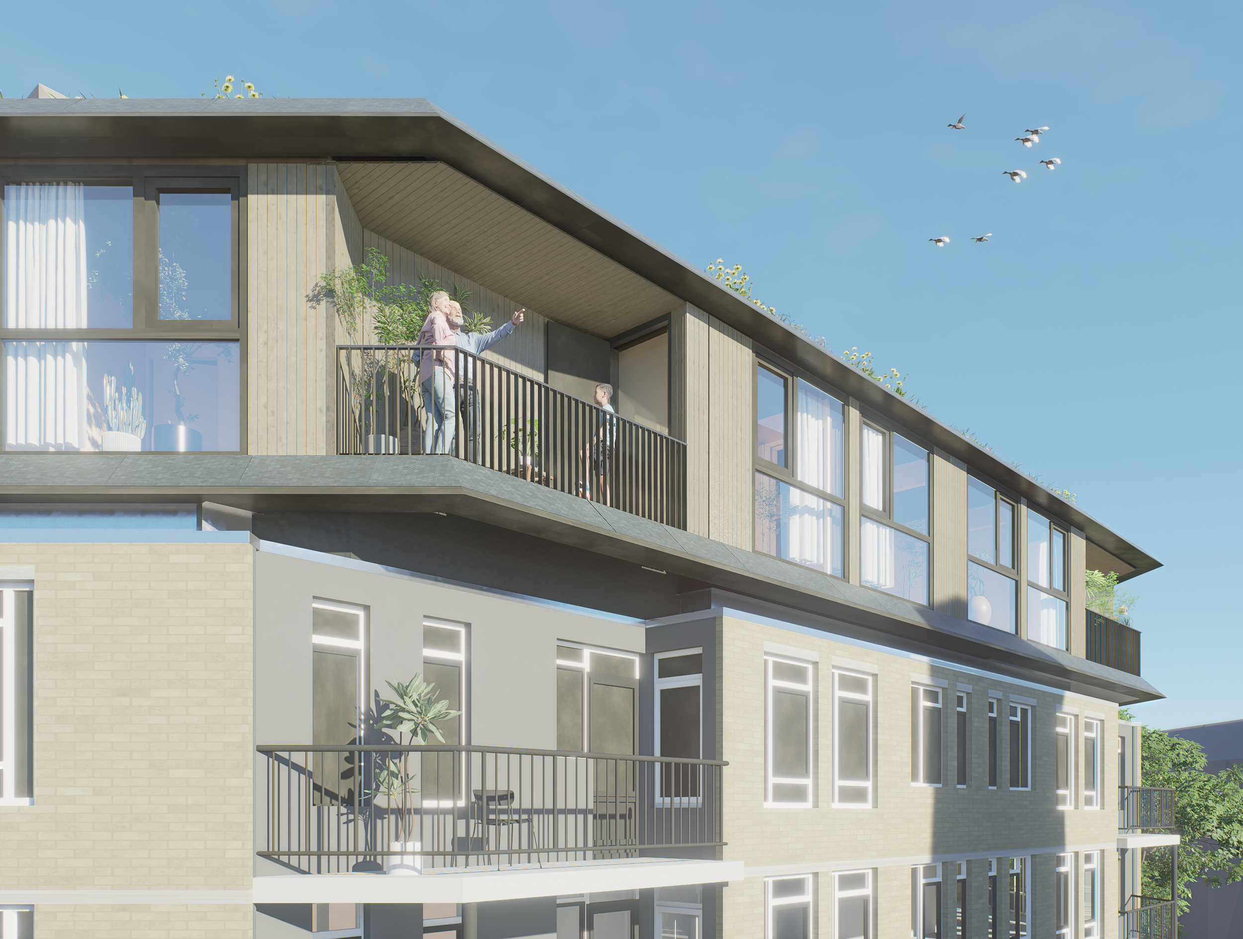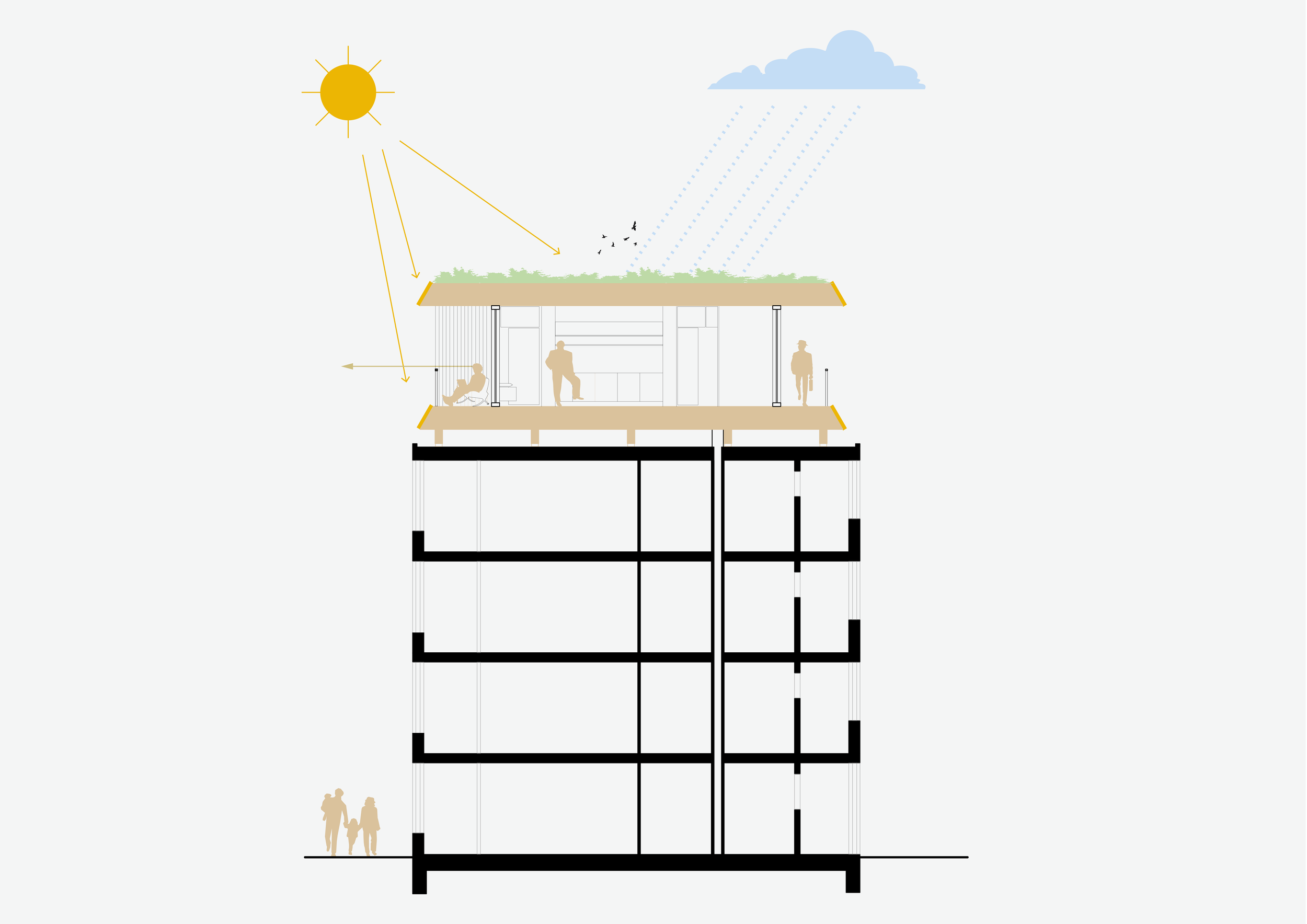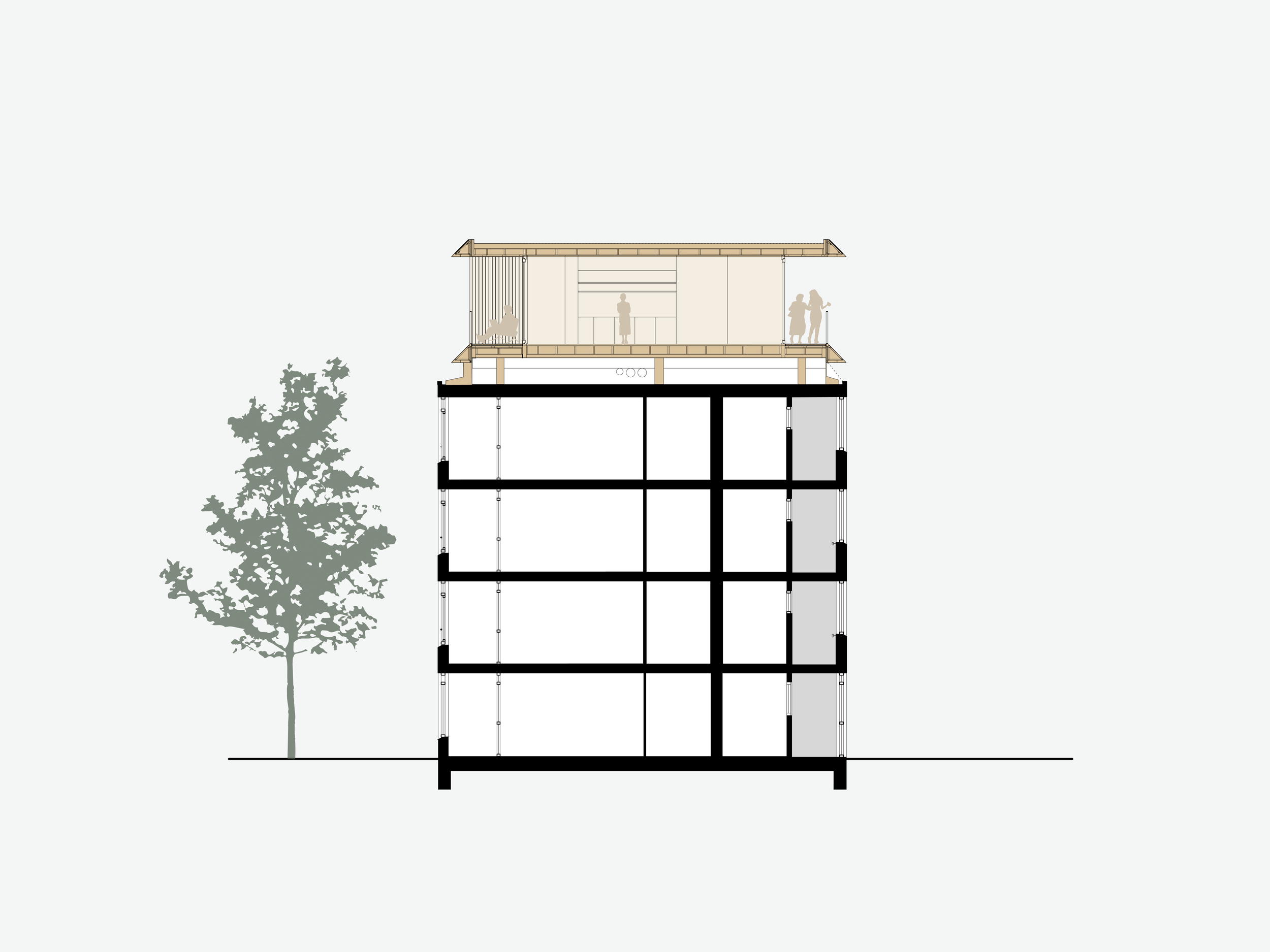 Together with VORM we developed the Optopper: a circular, prefab, biobased, all-wood housing module that can be placed atop post-war buildings. Conceived as a scalable product, it balances 80% standardisation with 20% customisation—accelerating delivery while leaving room for context and character. Units range from studios to two- to four-room apartments, suited to starters, small households and seniors who want to stay in their neighbourhood. The system reduces on-site time and noise, enabling new homes to be added while residents remain in place. In gallery flats it connects to existing lifts and stairwells; in portico flats, new access structures add circulation and extra dwellings. A choice of façades, green roofs and PV integration improves comfort, water buffering, energy generation and biodiversity, safe and efficient.