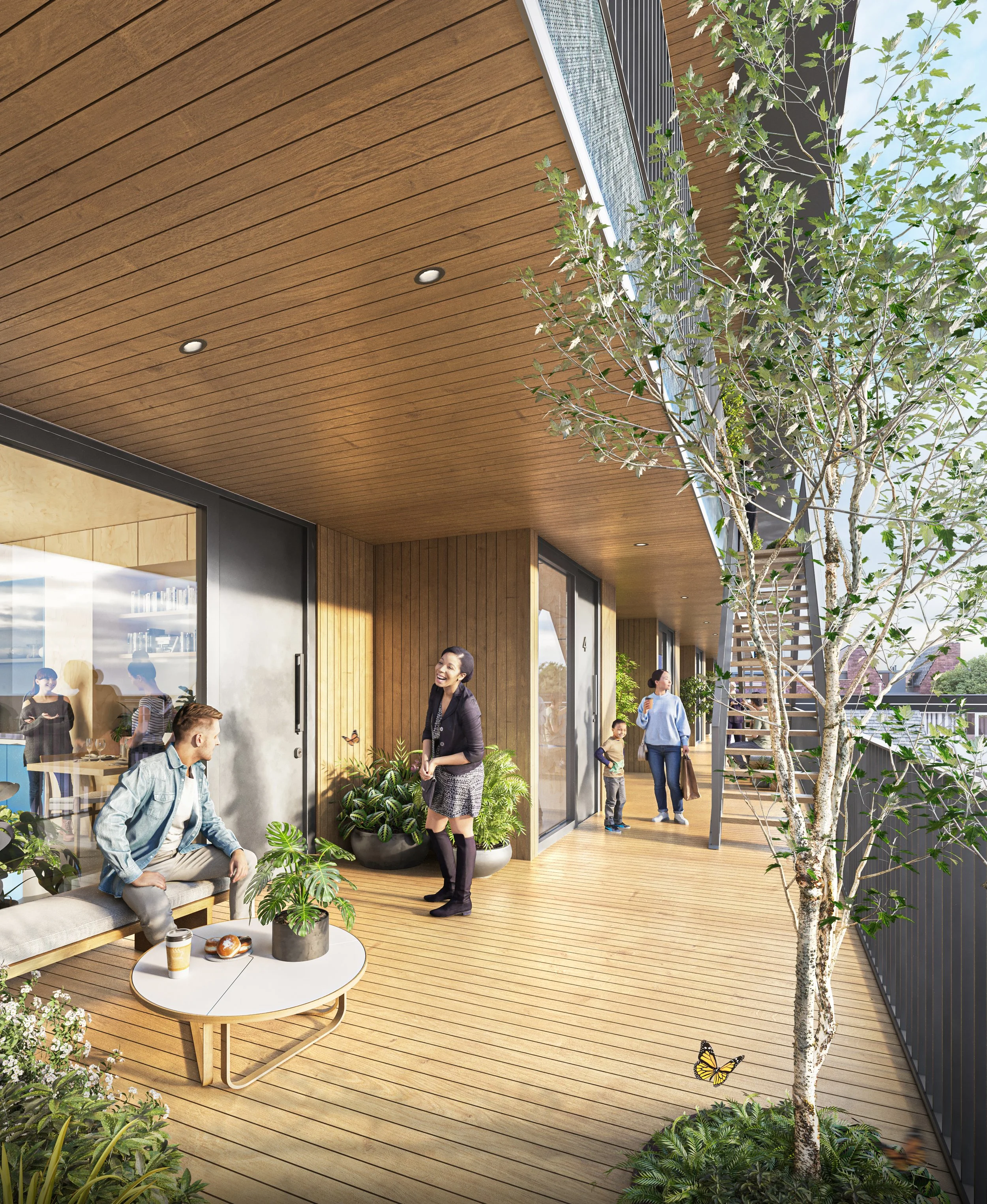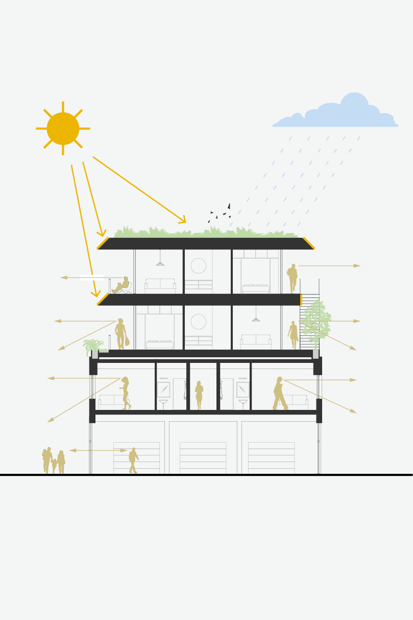 In collaboration with VORM, we designed the Optopper: a circular, prefab, all-wood, biobased and fully equipped modular housing system that can be placed on almost any post-war building. Conceived as a scalable residential product, the Optopper balances 80% standardisation with 20% customisation, enabling faster development and construction without sacrificing quality. The units range from studios to two- and four-room apartments, well suited to students, starters, young professionals and small families. Architecturally, the new volumes respond to their 1970s context through subtle horizontal shifts that break down the massing and create private outdoor terraces for each home. The revitalised building serves as a prototype for circular urban densification, combining reuse, adaptability and contemporary living. An added layer of new brick façades is placed over the existing brickwork, creating a warmer, more contemporary expression.